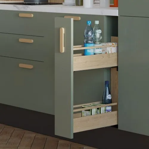 Выдвижные бутылочницы серии BOSCO изготовлены из массива в трендовой отделке «береза», это продолжение модных эко-тенденций в современном кухонном дизайне.