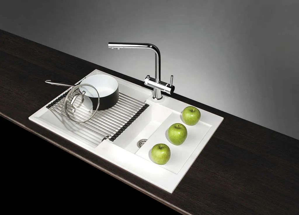 • Материал выдерживает высокие температуры до 280°С (но не стоит ставить на поверхность мойки горячие сковородки и кастрюли, т.к их температура может достигать 500°С).
