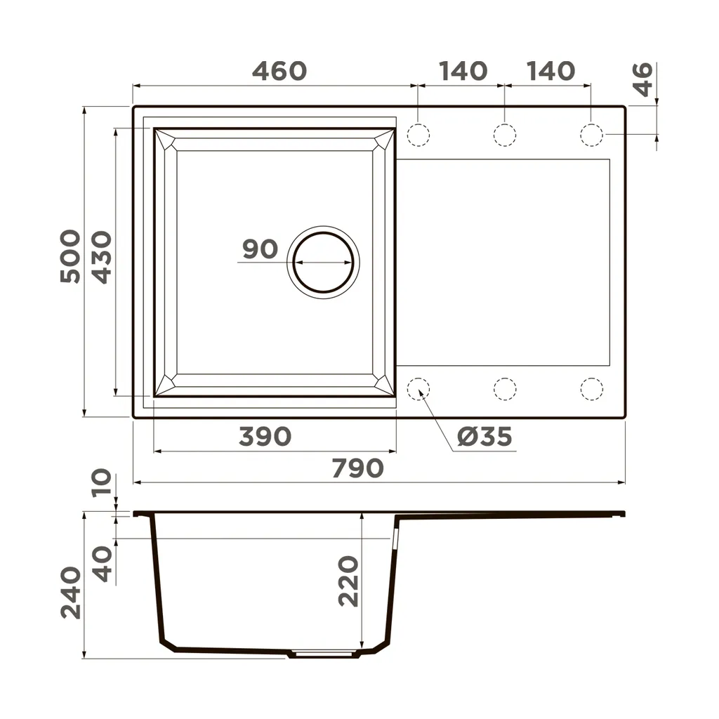• Материал выдерживает высокие температуры до 280°С (но не стоит ставить на поверхность мойки горячие сковородки и кастрюли, т.к их температура может достигать 500°С).