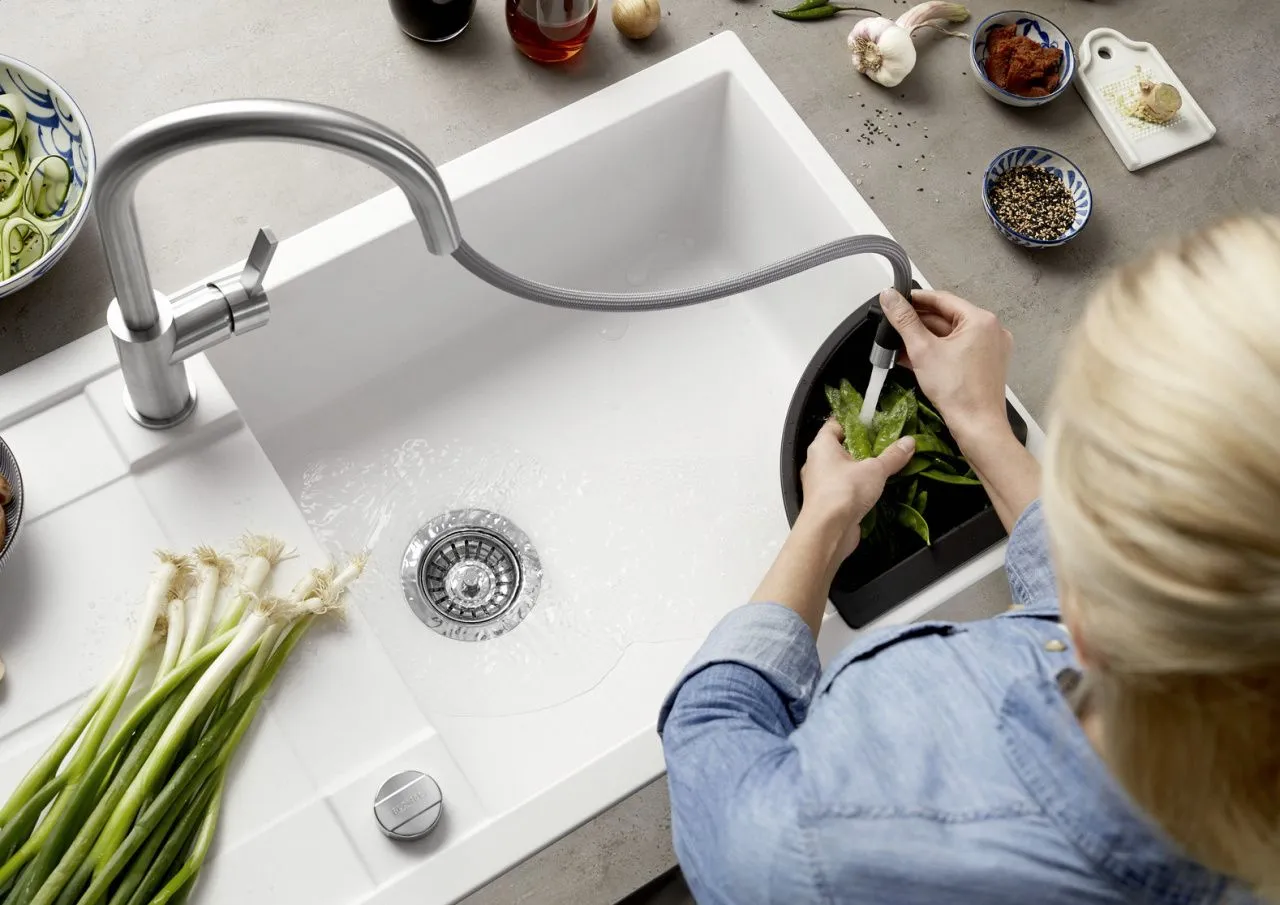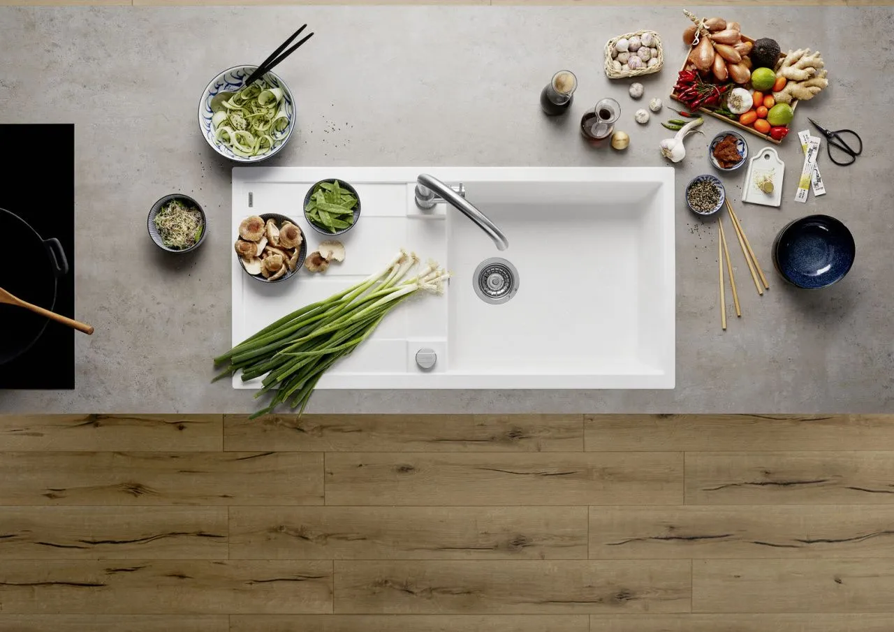 Врезная мойка из искусственного камня (silgranit) белого цвета, встраивается в шкаф шириной 60 см.