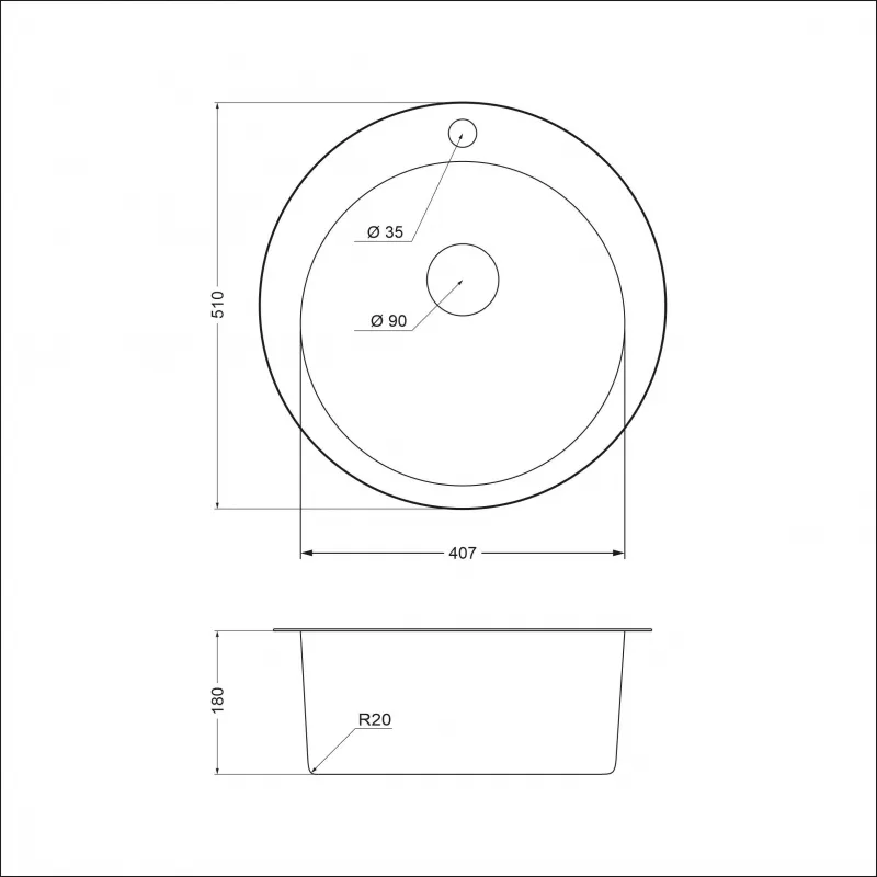 Вырез под мойку, мм от 490 мм Диаметр мойки 410 мм Габаритные размеры мойки: диаметр ( ) 510 мм Размеры чаши: диаметр и глубина ( ) 410х180 мм