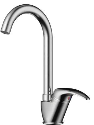 Смеситель выполнен в современном стиле и снабжен высоким поворотным изливом.