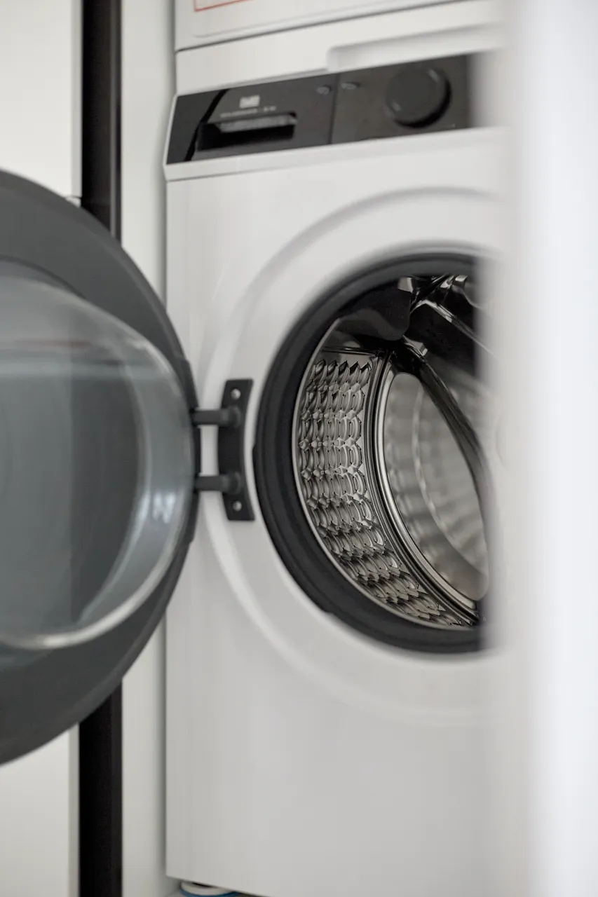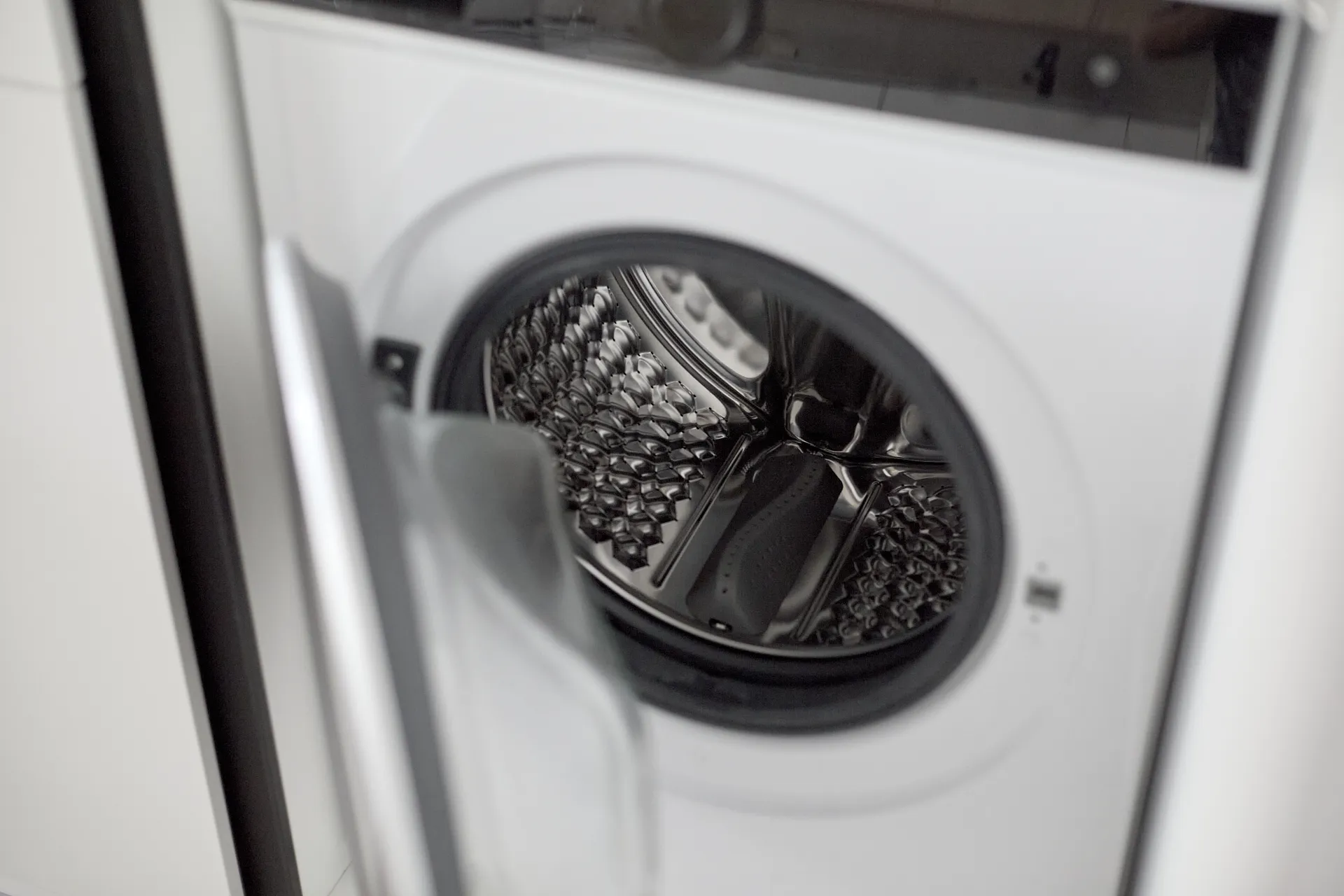 Стиральная машина белого цвета с максимальной загрузкой 9 кг и скоростью отжима 1400 об/мин обладает стильным лаконичным дизайном и большой вместительностью.