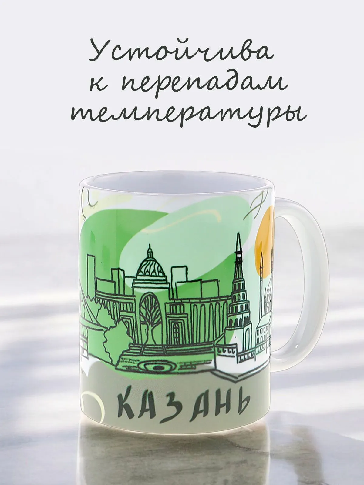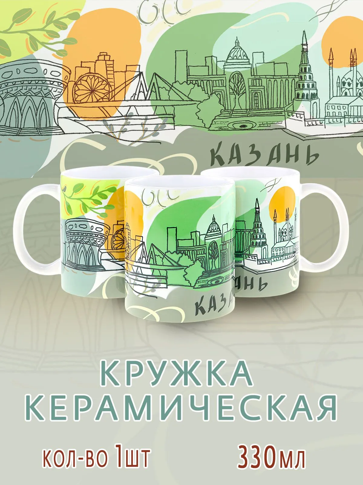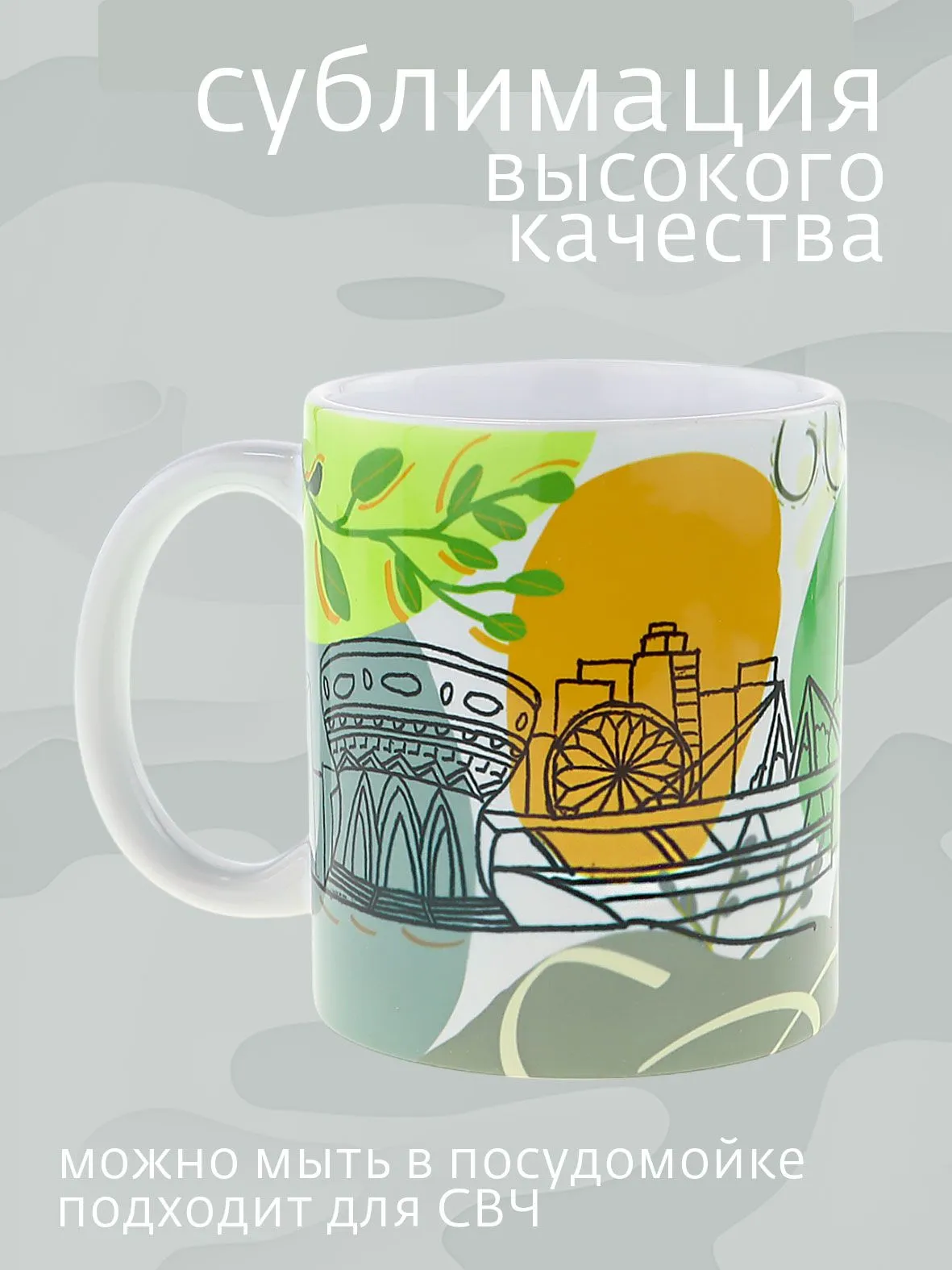 Керамическая кружка Коллаж Казани с графическим рисунком, Миллениум, загс Чаша, дворец земледельцев, Сююмбике. Объем 330мл.