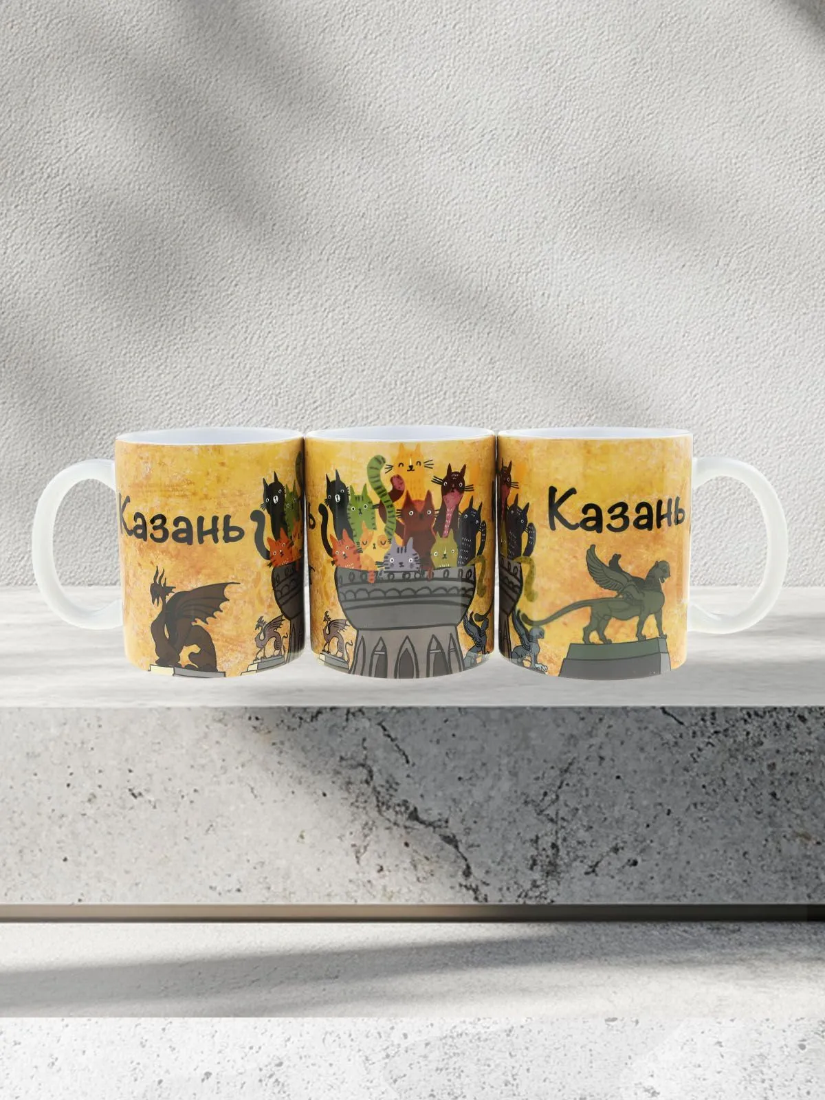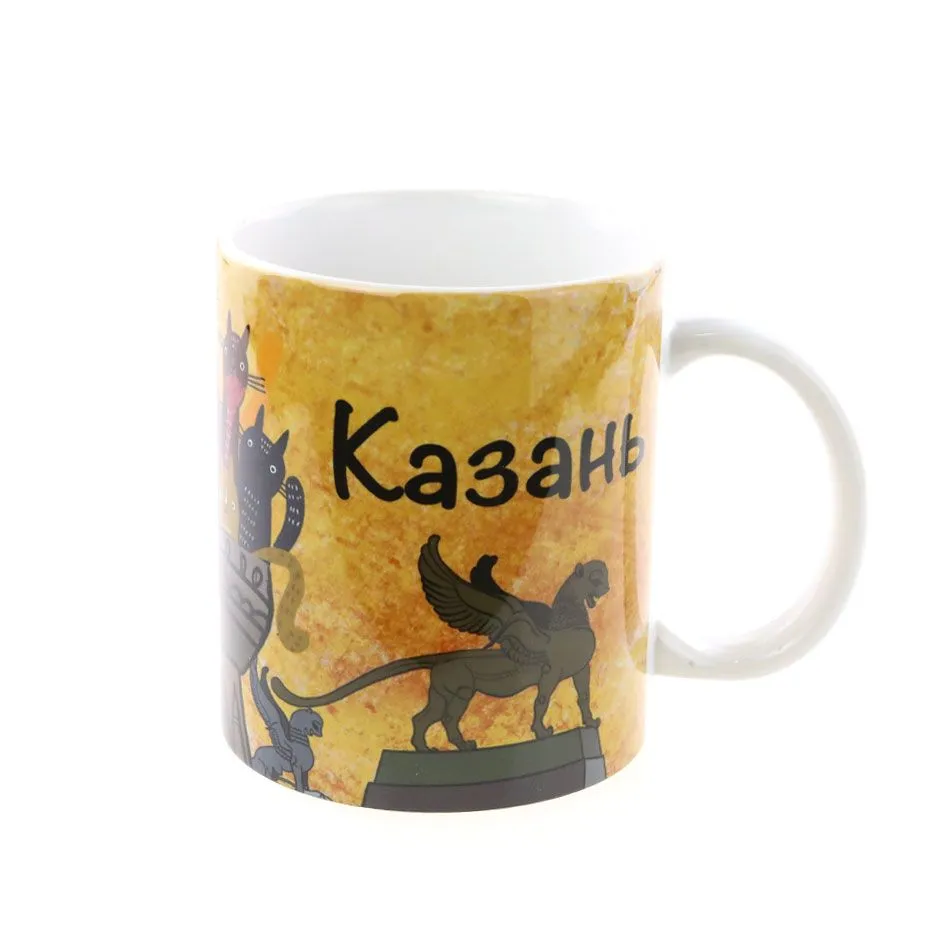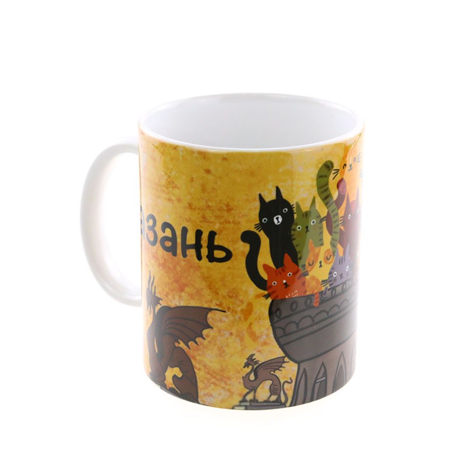 Керамическая кружка с уникальным рисунком котов ЗАГС ЧАША КАЗАНСКАЯ в желтом цвете, объем 330мл.