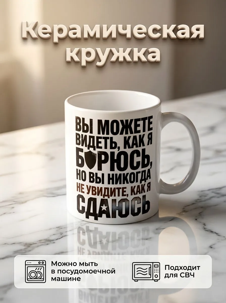Керамическая кружка с надписью "Вы можете видеть, как я борюсь, но Вы никогда не увидите, как я сдаюсь" - подарок мужу, отцу.