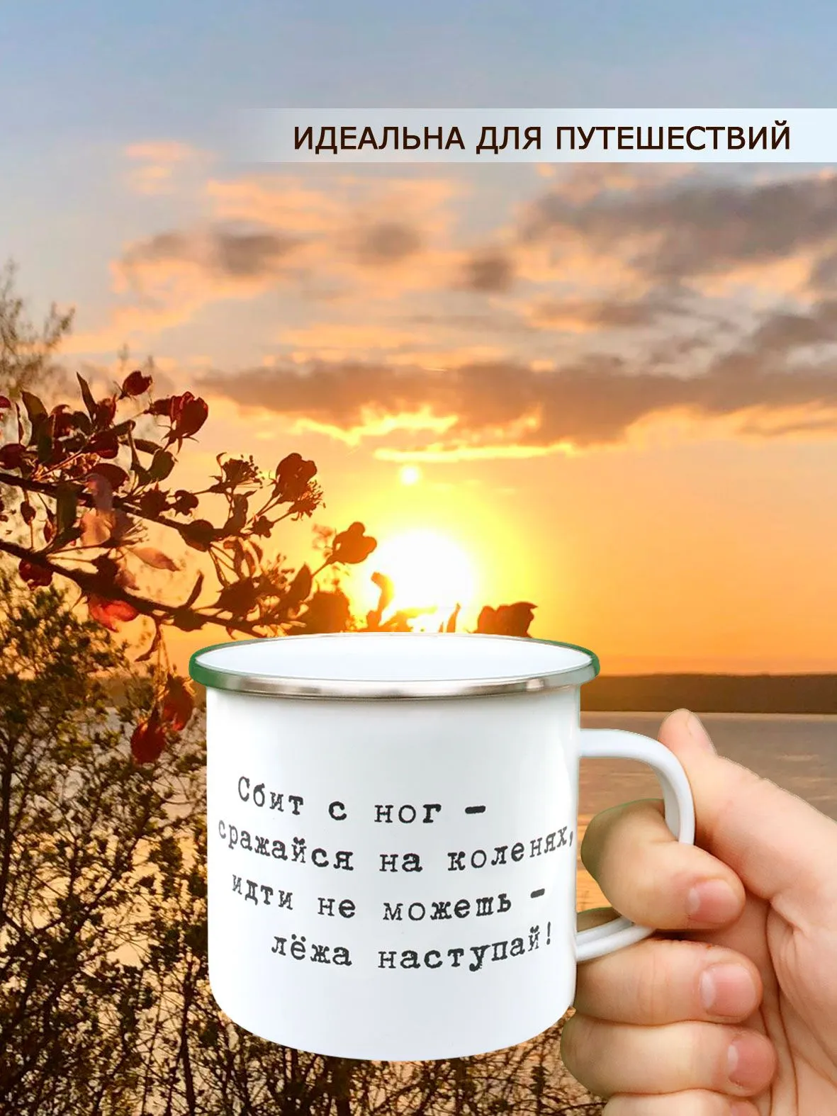 Металлическая эмалированная кружка "Сбит с ног - сражайся на коленях, идти не можешь - лежа наступай"