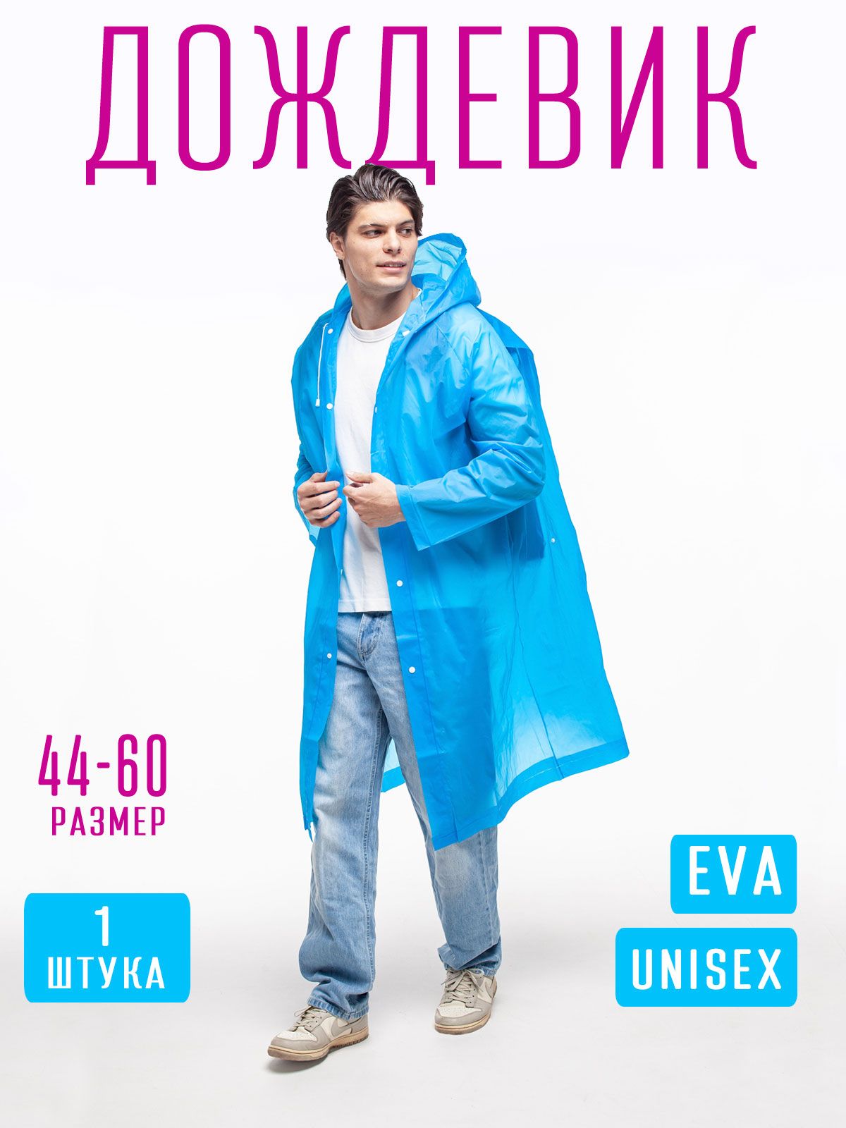 "content": "Дождевик синего цвета на кнопках с ПВХ-покрытием EVA RAINCOAT. Плащ предназначен для защиты от ветра, дождя и других атмосферных воздействий. Идеально подойдет для работы на улице, отдыха на природе, рыбалки, пикника и городских прогулок."