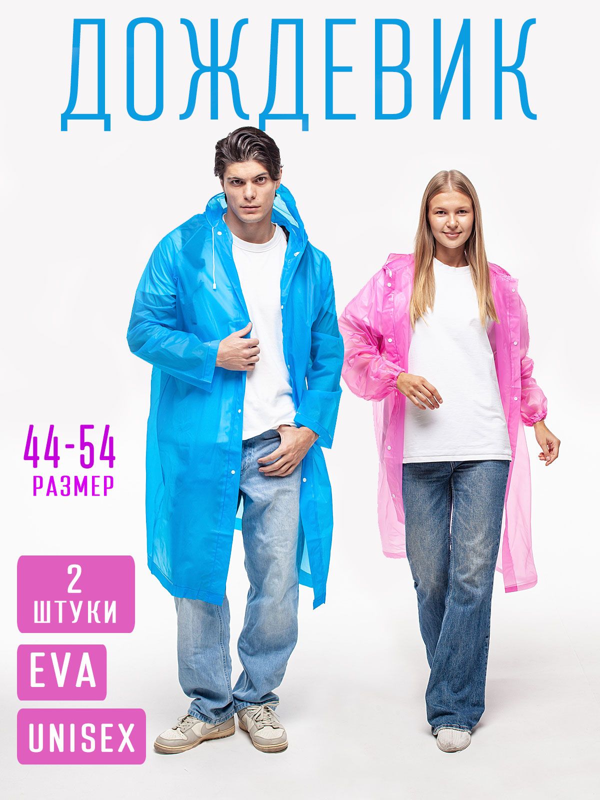"content": "Набор многоразовых дождевиков розового и синего цветов на кнопках с ПВХ-покрытием EVA RAINCOAT. Плащ предназначен для защиты от ветра, дождя и других атмосферных воздействий. Идеально подойдет для работы на улице, отдыха на природе, рыбалки, пикника и городских прогулок."