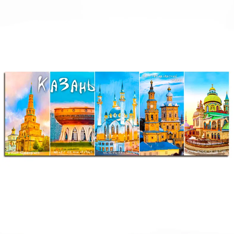 Изображение объединяет главные архитектурные символы столицы Татарстана: величественную мечеть Кул-Шариф, башню Сююмбике Казанского Кремля и современный дворец земледельцев. Такой магнит станет отличным напоминанием о культурном отдыхе, историческом туре или деловой поездке. Яркий дизайн вызывает положительные эмоции и украшает интерьер.