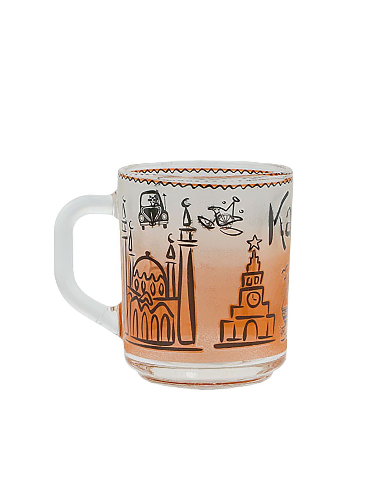 Кружка стеклянная с изображением достопримечательностей Казани, прямая, оранжевый цвет, 250мл., для чая и кофе