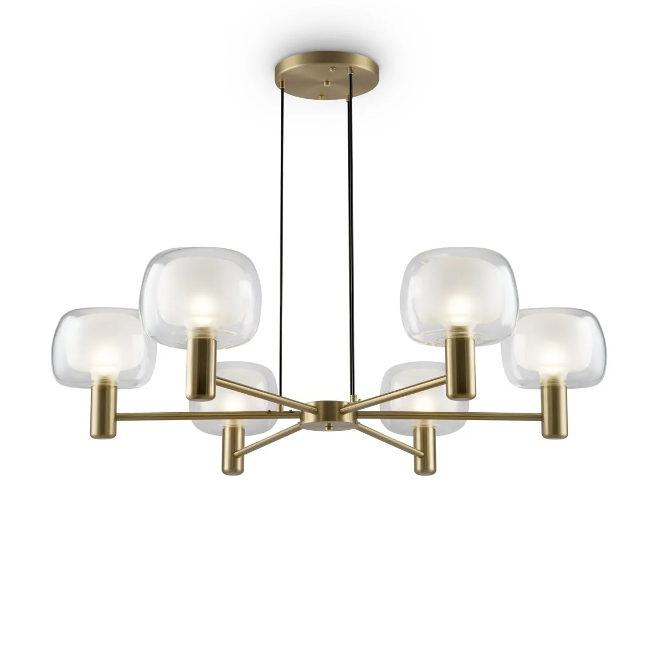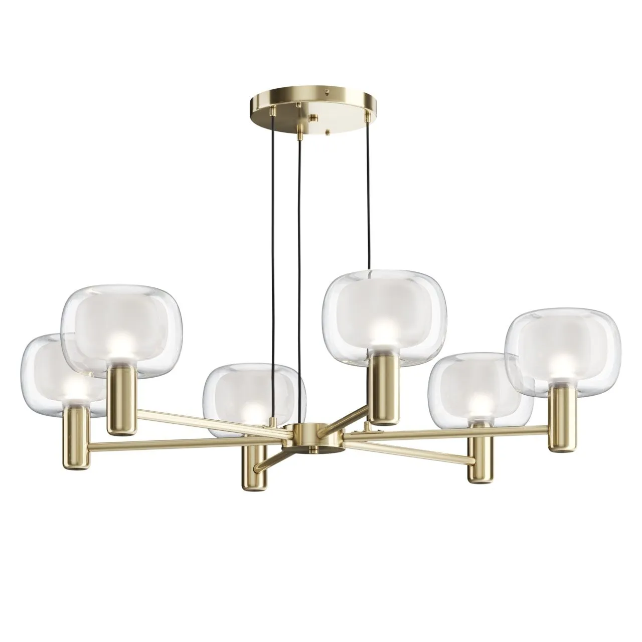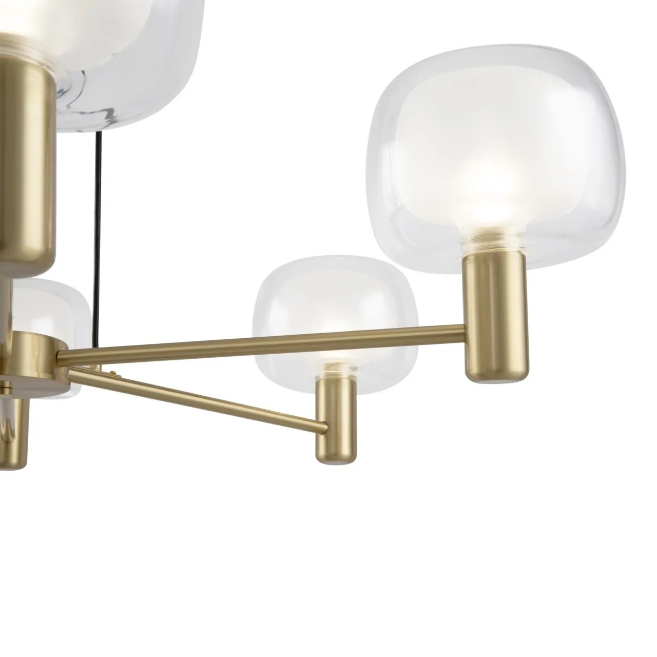 Светильник выполнен в стиле модерн и имеет шесть плафонов, изготовленных из прозрачного стекла. Внутри каждого плафона находится лампа с цоколем E27, которая обеспечивает яркое и комфортное освещение. Крепление к потолку выполнено из металла с покрытием цвета золота, что придает светильнику изысканность и элегантность.