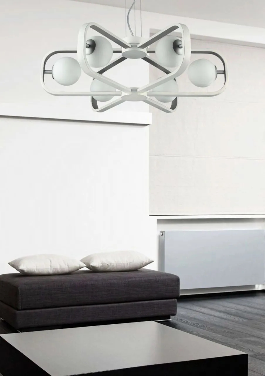 Символизируя вечное движение, светильники серии наполнят живостью и динамичностью освещаемое пространство. Чтобы подчеркнуть изогнутые линии металлического каркаса, использована золотая и серебряная краска. Опаловые плафоны в форме шаров изготовлены из выдувного стекла. Высоту подвесных светильников можно регулировать длиной троса или шнура.