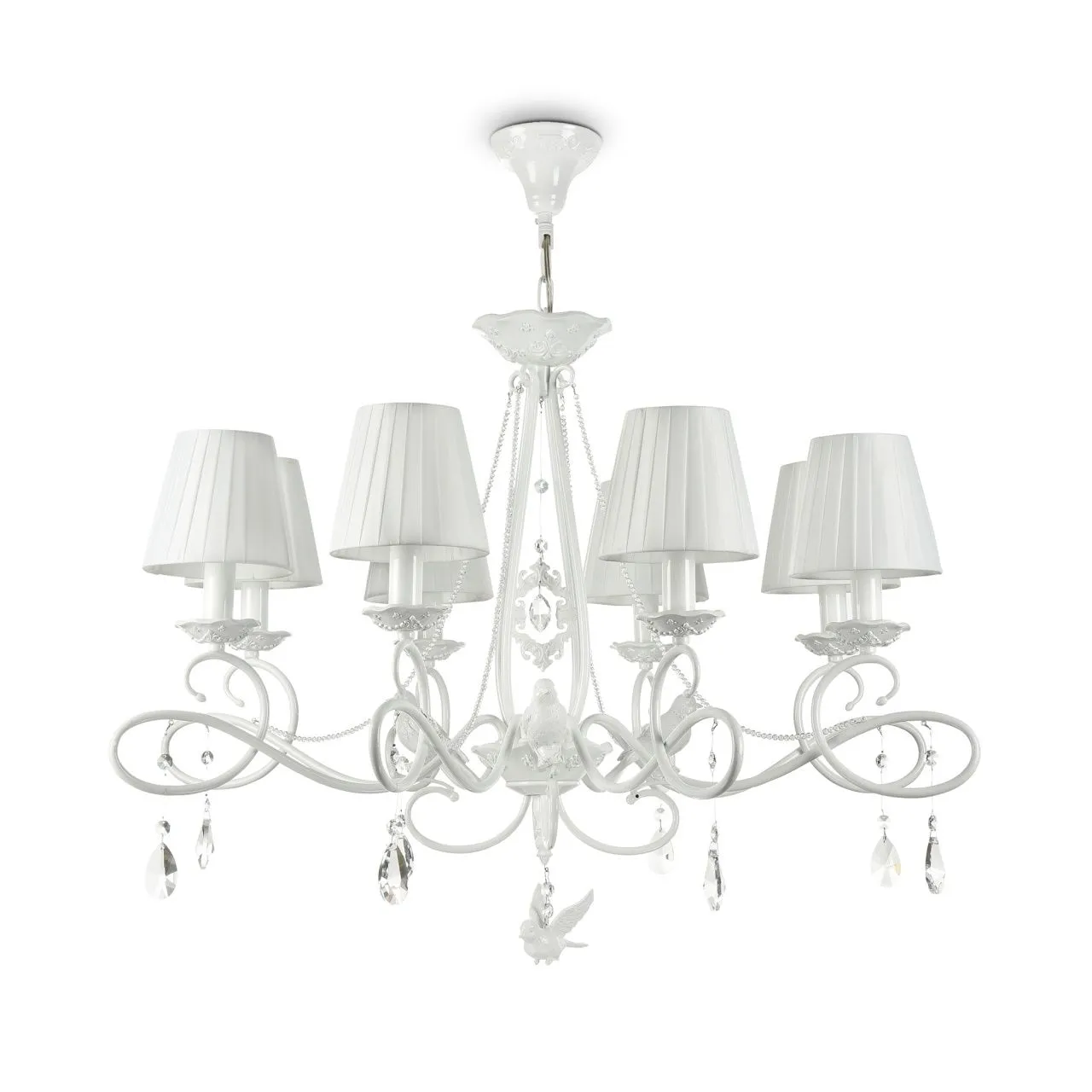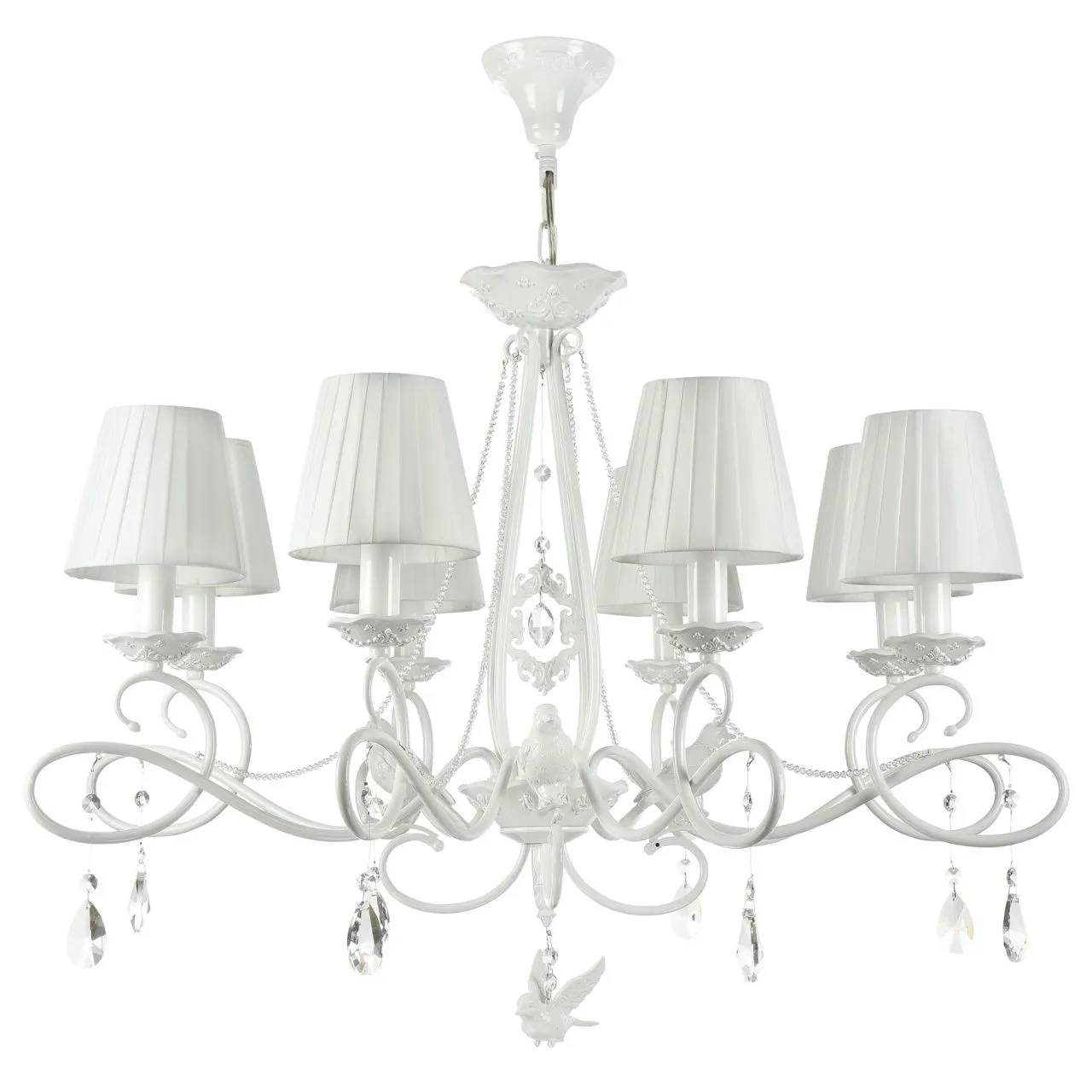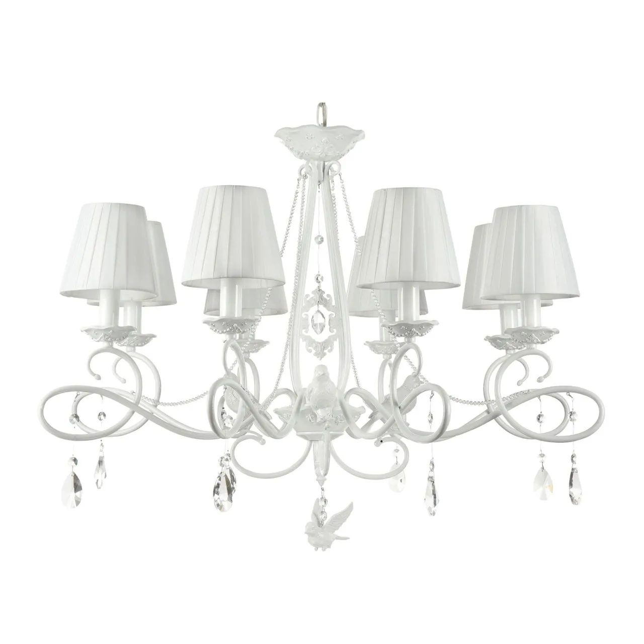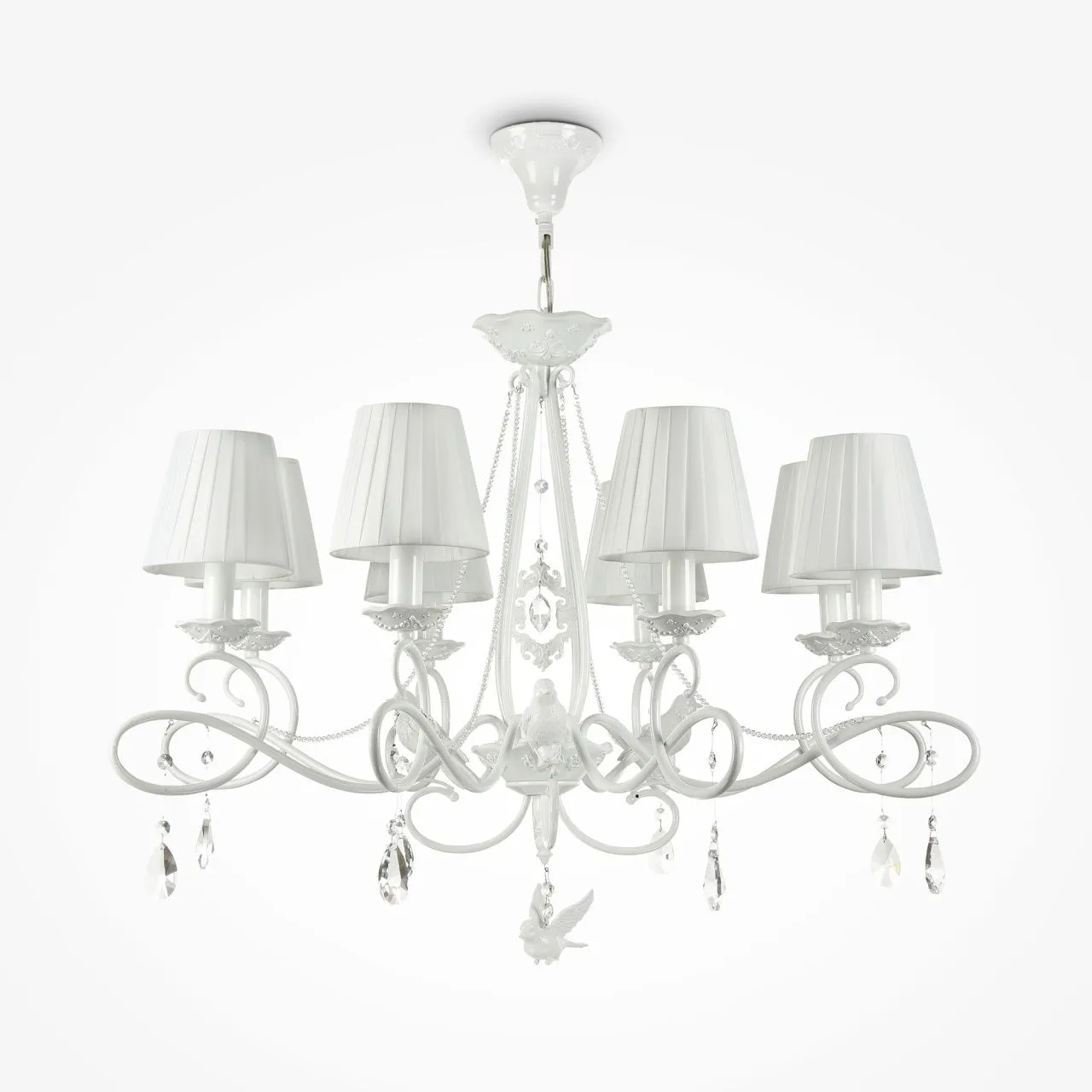 Утонченная серия светильников, выполненных в классическом стиле, добавит свежести и легкости в интерьер. Металлический каркас белого цвета декорирован миниатюрными фигурками птиц. Конструкцию украшают подвески из кристаллов. Лампочки скрываются за абажурами из белой органзы. Высота люстр регулируется длиной цепи.