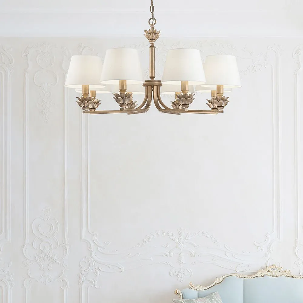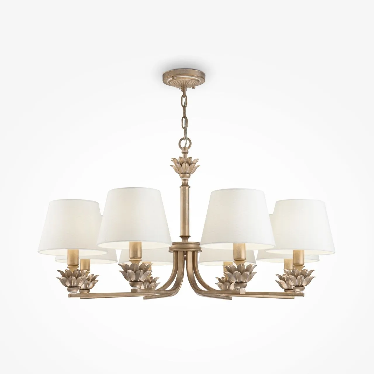 Самобытный дизайн серии сочетает в себе европейскую стилистику с экзотическим декором. Элементы из штампованного металла напоминают листья тропических растений. Арматура покрашена в золотистый цвет с эффектом старения. Абажуры из белой ткани, нанесенной на ПВХ. Высоту люстр возможно регулировать, изменяя длину цепи.