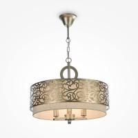 Контурная линия просечного орнамента контрастирует со светлым абажуром. Эффект усиливается при включенном свете. Арматура и декоративные обручи изготовлены из металла и выкрашены в цвет латунь". Абажур из хлопка на ПВХ. Внутреннее устройство потолочных светильников закрыто рассеивателем из того же материала, что и абажур. Подвесные светильники регулируются по высоте длиной цепи."