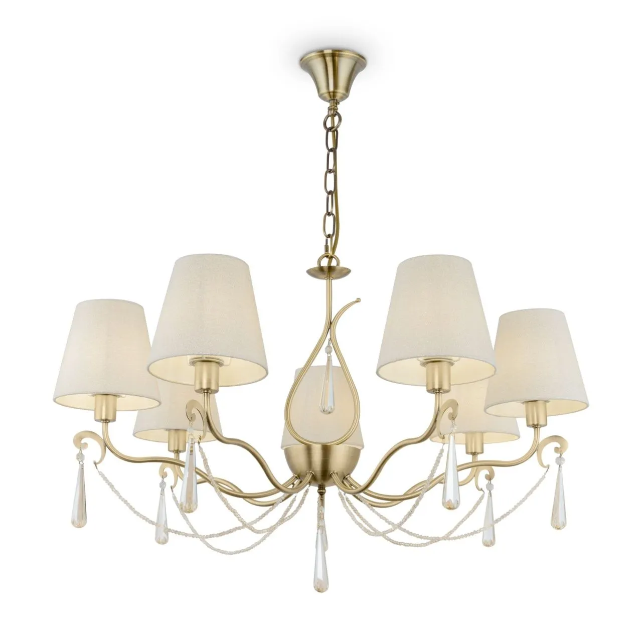 Плавные, обтекаемые формы – тренд современного светодизайна, который особенно гармонично смотрится в классическом переосмыслении. Арматура светильника выполнена из металла благородного цвета античной латуни. Аристократичная красота подчеркнута изящным изгибом рожков и богатым декором из хрусталя каплевидной формы. Тканевые абажуры с фактурной поверхностью добавляют композиции особый шарм и обеспечивают мягкий поток света. Высоту подвесных светильников можно регулировать, учитывая размеры помещения. Серия из трех люстр на 12, 7 и 5 плафонов, подвеса, бра, настольной лампы и торшера – готовый ансамбль для подсветки интерьеров в стиле классика, неоклассика, ар-деко, модерн.