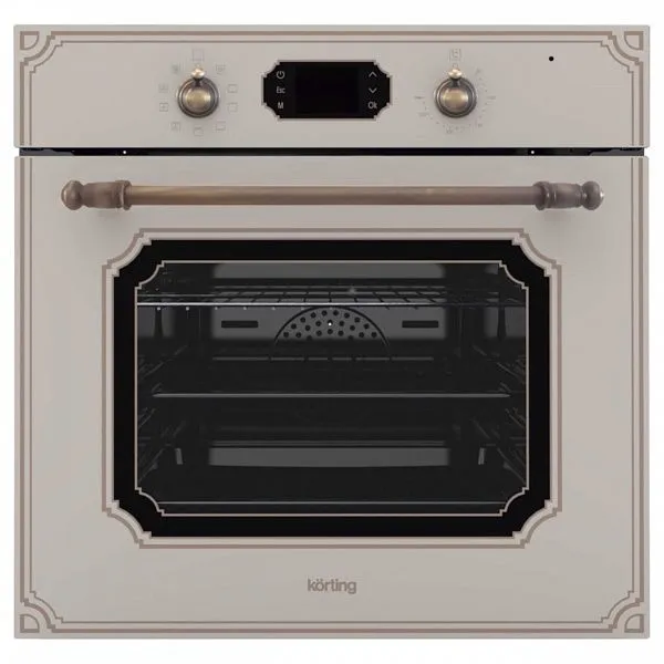 Электрический духовой шкаф, серия РЕТРО, дизайн Bizantium Электронное управление, Цветной TFT дисплей с индикацией функций приготовления и таймера, Электронный таймер отключения и отложенного старта, Автопрограммы (книга рецептов), Материал наружной поверхности двери и контрольной панели - стекло, 9 режимов, Температурный щуп, Одноуровневые телескопические, направляющие