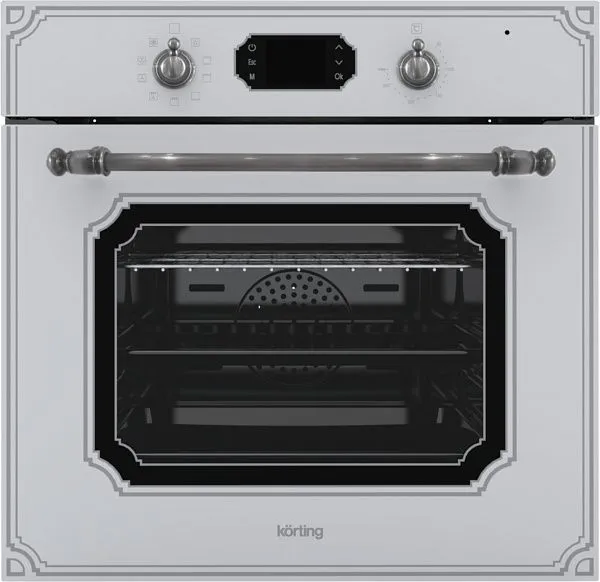 Автоматическое отключение, Эмаль легкой очистки серого цвета, Каталитическая очистка, Аксессуары: Противень для выпечки, Глубокий противень, Хромированная решетка, цвет - белое стекло, ручка и регуляторы – состаренное серебро