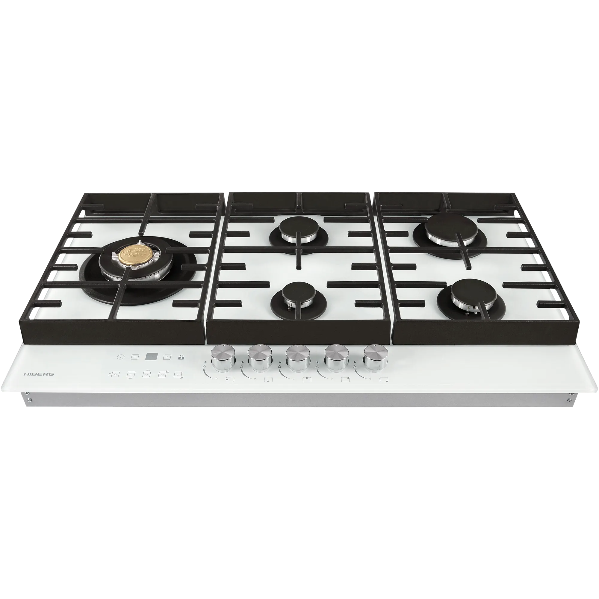 Встраиваемая газовая варочная поверхность HIBERG VM 9155 W из закаленного стекла в белом цвете, оснащена 5 конфорками и функциями: автоматический «электророзжиг», «газ-контроль» и сенсорный таймер отключения газа. Варочная поверхность шириной 90 см подходит для установки на просторных кухнях и для большой семьи.
